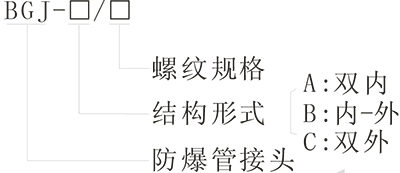 > 按照產品型號逐條選擇并注明防爆標志,例如:需要一內一外 G3/4″螺紋防爆管接頭,則產品型號為 BGJ-G3/4″(外)/G3/4″(內) ExdⅡC Gb;需要內 G3/4″外 G1 1/4″螺紋防爆管接頭,則產品型號為 BGJ-G3/4″(外)/ G1 1/4″(內)b ExdⅡC Gb。